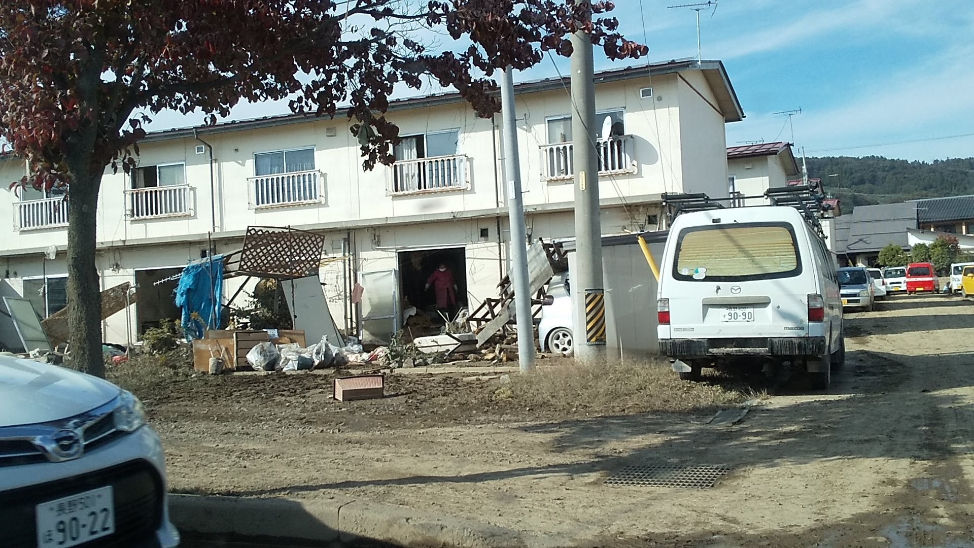 臭いとともに、泥から舞い上がる埃の中、夜から予想されている大雨の前にと、被災者の皆さんは疲れている中、必死に作業されていました。街のあちこちで地元本宮高校の生徒たちがボランティア活動に参加している姿が目にとまりましたが、まだまだ見通しはたっていない様子でした。