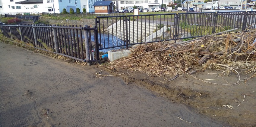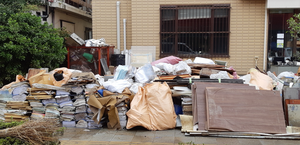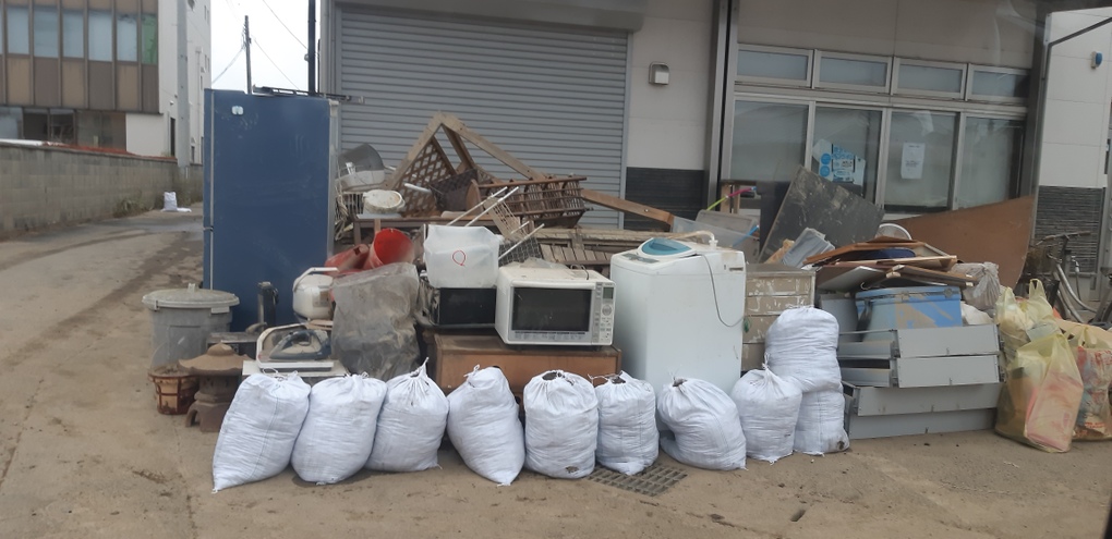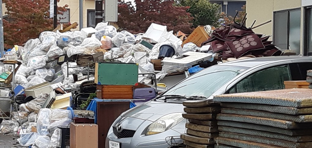 沼津市大江地区に。既に水は引き水害ゴミが道路添いに積み上げられている。