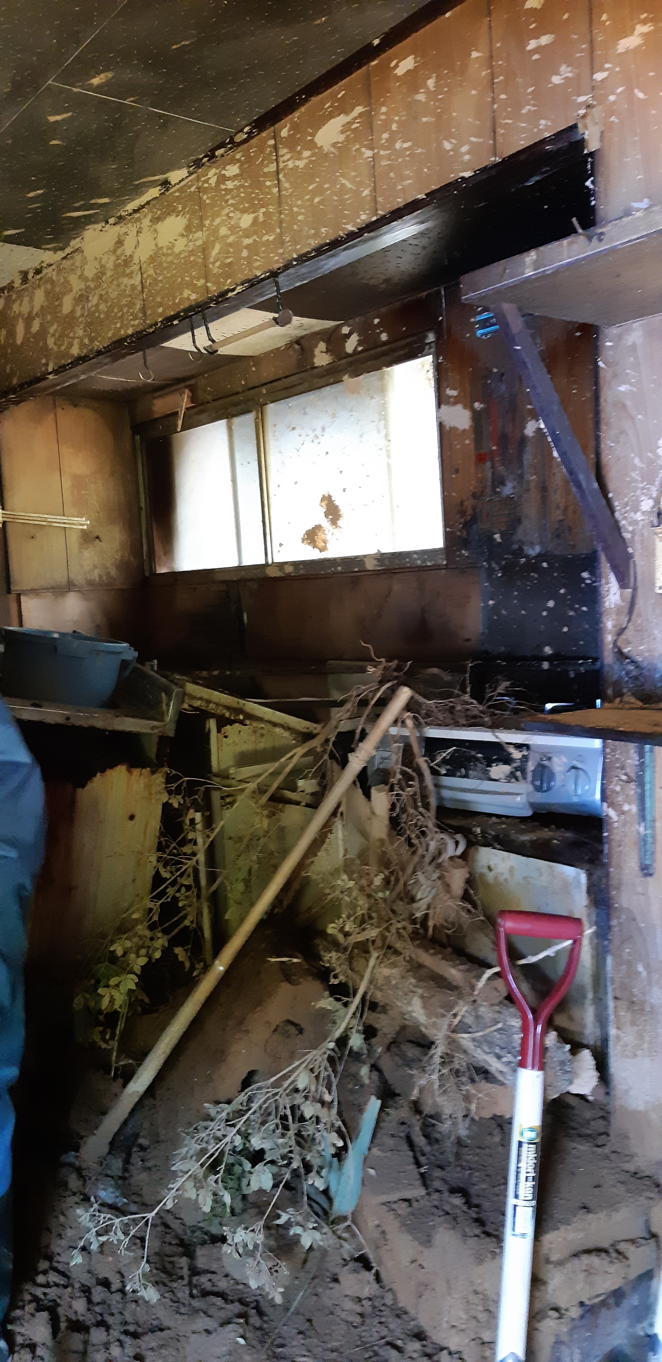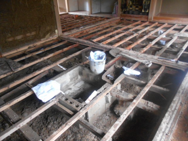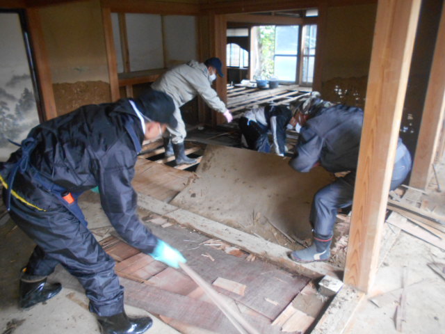 赤沼のお宅に到着すると2階建てで約2メートル以上浸水しており、1階部分の床板をはがす作業をご親戚やお仕事仲間の方々でされていました。