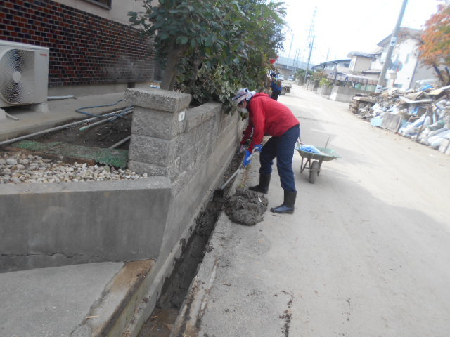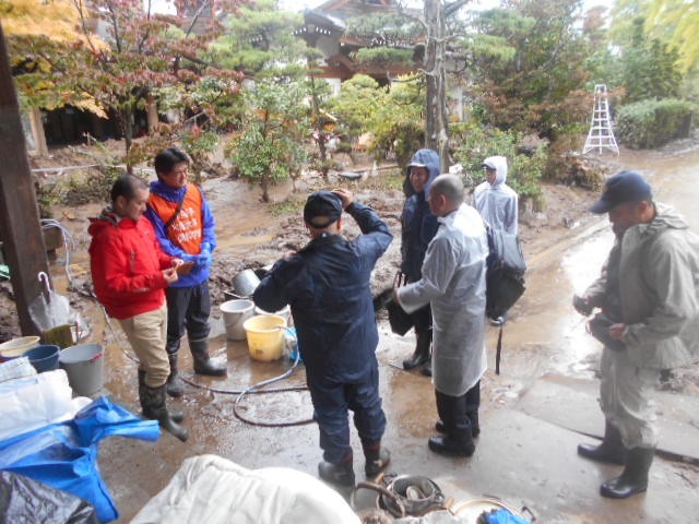 以前お伺いした避難所や被災家屋などを訪問させていただきました。また、災害ボランティアセンターに登録して千曲川の決壊場所近くにある赤沼地区のお宅で泥出しや片付け作業、あるいは、お寺の泥出しや洗浄作業などをお手伝いしてきました。
