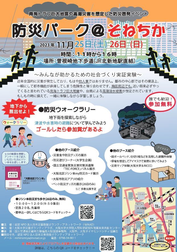 11/5(土)、11/6(日)の二日間、曽根崎地下歩道(JR北新地駅直結)にて、南海トラフ巨大地震や高潮災害を想定した防災啓発イベント「防災パーク@そねちか」を開催しました。